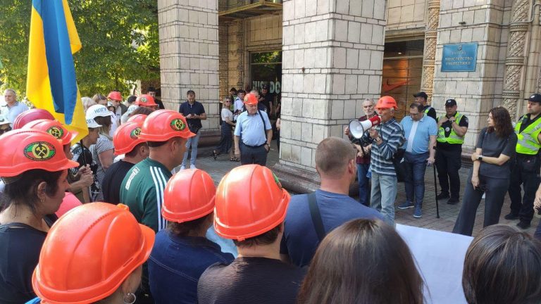 Gruvearbeidere fra Lviv demonstrerer i Kiev mot langvarig manglende lønnsutbetalinger, 1. august 2025